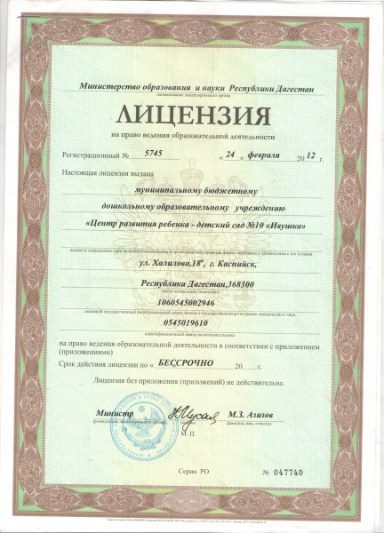 Образовательная деятельность муниципального бюджетного дошкольного образовательного учреждения «Центр развития ребенка - детский сад №10 "Ивушка» осуществляется по адресу: 368300, Республика Дагестан. ул. М.Халилова 18 "А"